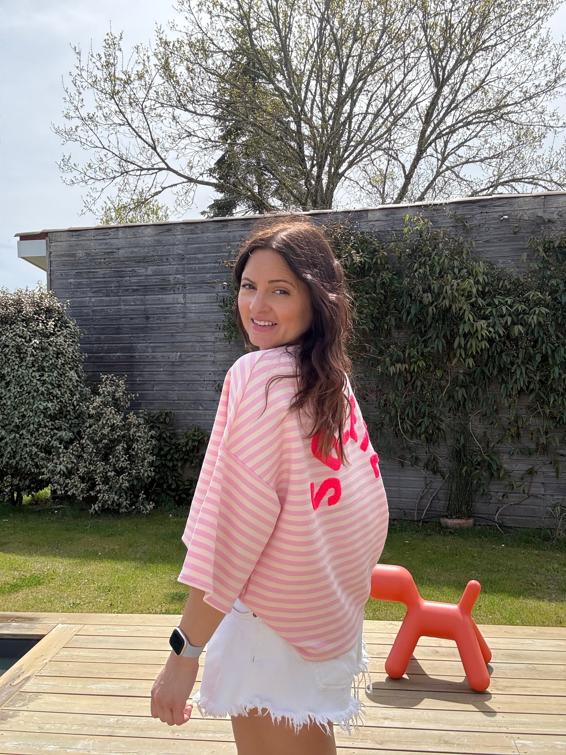 Le t-shirt qui sent bon l’été ☀️💗 Avec ses rayures douces et son dos “SOLEIL” en bouclette fluo, il apporte direct du peps à ton look.